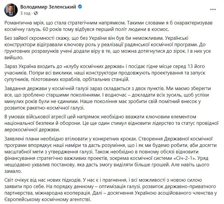 Такое заявление сделал президент Украины Владимир Зеленский в понедельник, 12 апреля, на своей странице в Facebook. Он отметил, что сейчас наша страна является одним из 13 участников "клуба космических государств", где занимает достойное место.