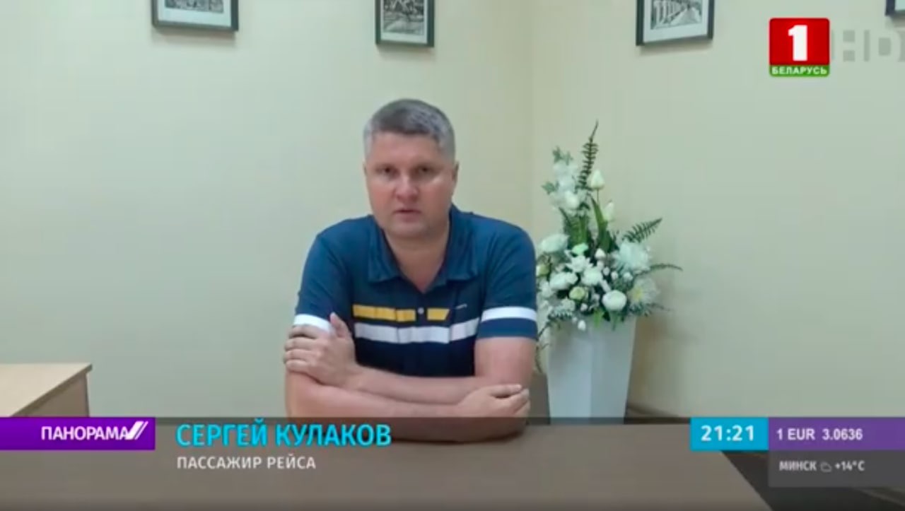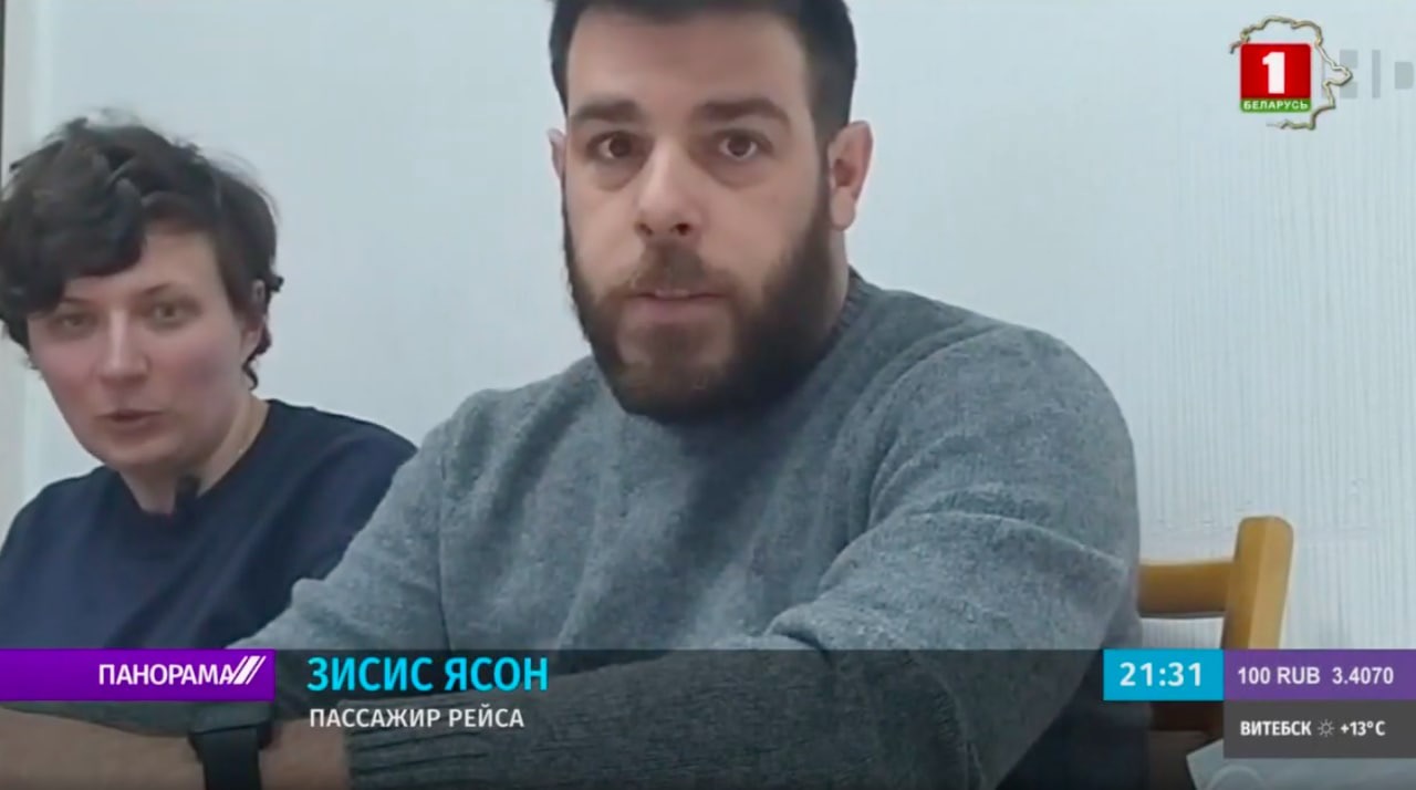 Затем показали фрагмент с еще одним мужчиной по имени Зисис Ясон. Он объяснил на английском, что ехал из Афин в Вильнюс, а затем у него был рейс из Вильнюса в Минск — чтобы навестить жену. Мужчина сказал, что за 15 минут до посадки им объявили: из-за вопроса по безопасности они приземлятся в Минске.