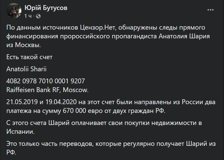 "Есть такой счет Anatolii Sharii 4082 0978 7010 0001 9207 Raiffeisen Bank RF, Moscow. 21.05.2019 и 19.04.2020 на этот счет были направлены из России два платежа на сумму 670 000 евро от двух граждан РФ", – написал он.