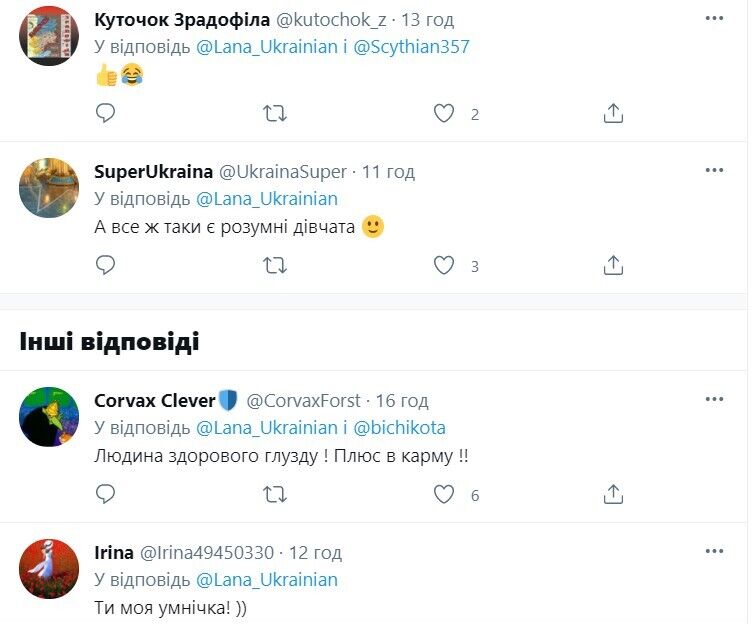 Также они поставили ее в пример украинским блогершам, которые в последнее время очень часто попадают в скандалы из-за своих заявлений об украинском языке, войне на Донбассе и т. д.
