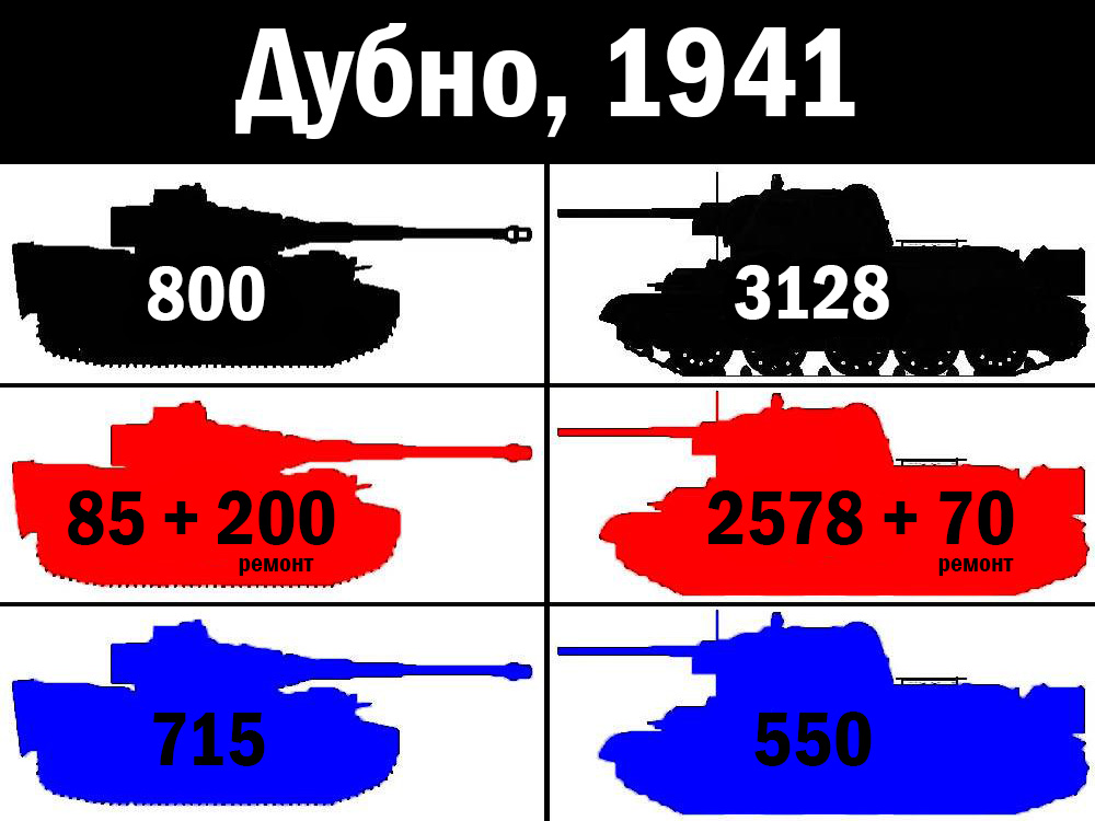 ПС Возможно тут не очевидно. Черное – общее количество, красное – потери, синее – осталось целым. Слева – Вермахт, справа – РККА