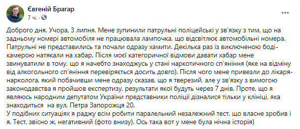 "После моего категорического отказа давать взятку, меня обвинили в том, что я якобы нахожусь в состоянии наркотического опьянения. Затем отвезли к врачу-наркологу, который, увидев меня, сразу сказал, что я трезвый. Но в связи с требованием законодательства я прошел экспертизу, результаты которой будут через семь дней", – подчеркнул Брагар.