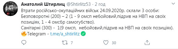 "Безвозвратные (200) - 2 (1 - 100 омсбр 1 АК, не боевой, самоубийство на фоне злоупотребления алкогольными напитками, 1 - 11 омсп 1 АК, не боевой, в результате подрыва на НВП). Санитарные (300) - 4 (1 - 1 омсбр 1 АК, 1 - 4 омсбр 2 АК, не боевой, в результате неосторожного обращения с оружием, 1 - 2 омсбр 2 АК, 1 - 3 омсбр 1 АК, не боевой, в результате ухудшения состояния здоровья)", - написал он.
