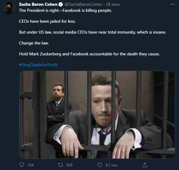 Известный комический актер из Великобритании Саша Барон Коэн поддержал президента США Джо Байдена, который заявил, что Facebook убивает людей дезинформацией о коронавирусе, и призвал американские власти привлечь к ответственности главу компании Марка Цукерберга. Об этом актер написал в Twitter.