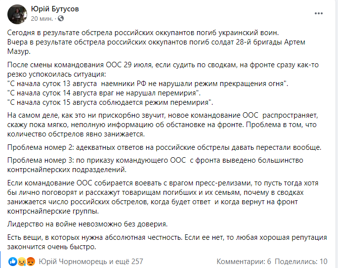 "Как это не прискорбно звучит, новое командование ООС распространяет, скажу пока мягко, неполную информацию об обстановке на фронте. Проблема в том, что количество обстрелов явно занижается. Проблема номер 2: адекватных ответов на российские обстрелы давать перестали вообще. Проблема номер 3: по приказу командующего ООС с фронта выведено большинство контрснайперских подразделений", – сказано в сообщении.