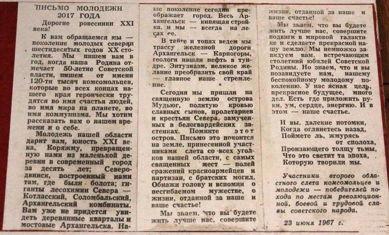 В уже далёком 1967 году группа советских студентов (или как они себя сами обозначили, "участники второго областного слета комсомольцев и молодежи — победителей похода по местам революционной, боевой и трудовой славы советского народа") написали письмо-послание в 2017 год, обращённое к людям нашей эпохи, пишет Максим Мирович.