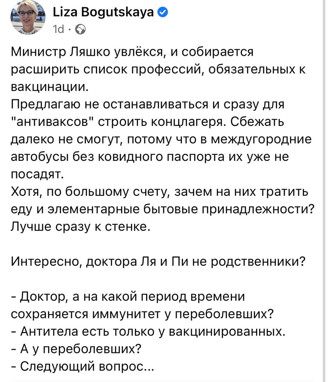 Русскоязычный блогер и депутат от «Слуги народа» Лиза Богуцкая взялась подогревать антивакцинаторские настроения в украинском обществе. На своей странице в Facebook она опубликовала пост, в котором осудила стремление Министра здравоохранения Виктора Ляшко расширить список профессий, для которых прививки от Covid-19 станут обязательными.