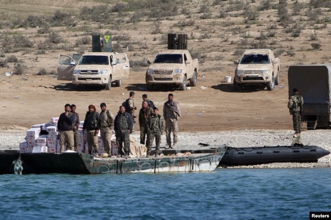 Бойцы “Сирийских демократических сил”, курдско-сирийского формирования, принявшего атаку проасадовских сил и “ЧВК Вагнера” вечером 7 февраля 2018 года, на восточном берегу Евфрата