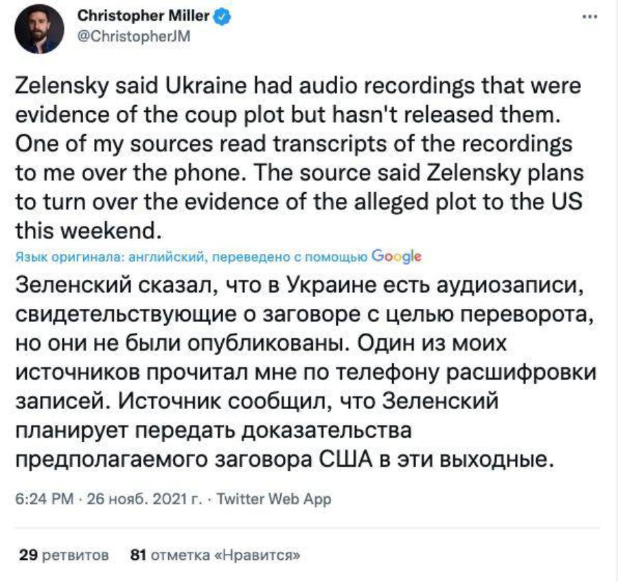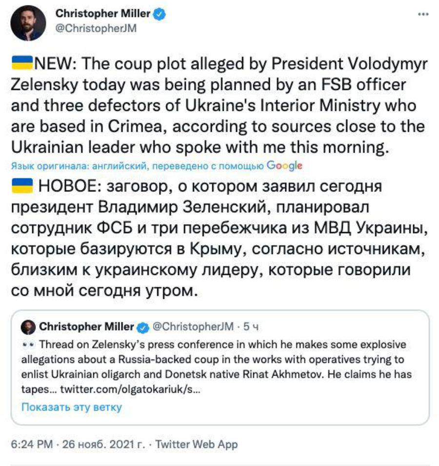 «Источник, близкий к Зеленскому, ясно дал понять, что доказательства, которыми располагает Украина, не показывают прямого участия Ахметова, но что он упоминается четырьмя предполагаемыми заговорщиками, которые говорят, что им «необходимо быть готовыми к переезду и работе с Ахметовым»…