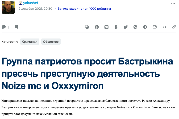 В связи с изложенным просим Вас принять меры по пресечению преступной деятельности Noize mc (Иван Алексеев) и Oxxxymiron (Мирон Федоров).