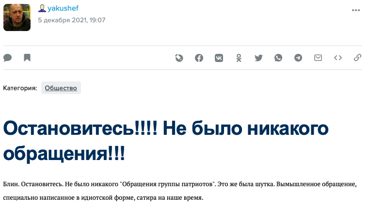 «Группа патриотов» дала заднюю и сообщила, что вообще-то их обращение было вымышленным и специально составленным в идиотской форме.
