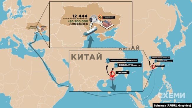 В марте из Грузии на завод импортировали еще одну партию: около 1400 блоков фирмы Bitfury. Примерно в этот же период в Украину завезли другое оборудование для производства криптовалют – на этот раз из Китая.