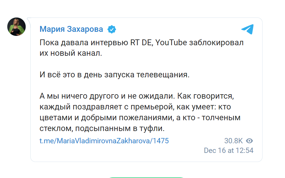 До этого RT сообщал о блокировке двух своих каналов без возможности восстановления. Перед этим YouTube заблокировал четыре видео RT DE о COVID-19, а затем запретил каналу в течение недели публиковать новые ролики.