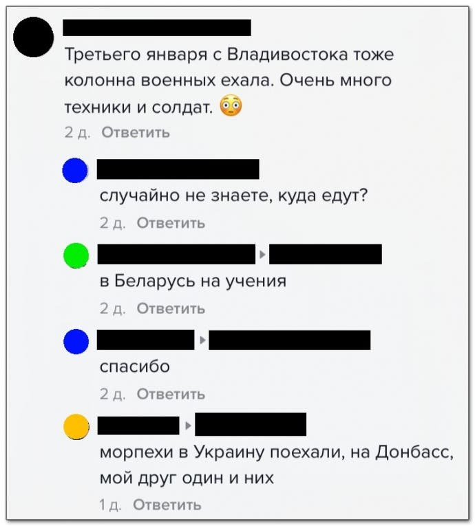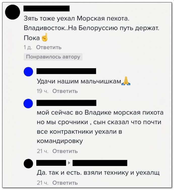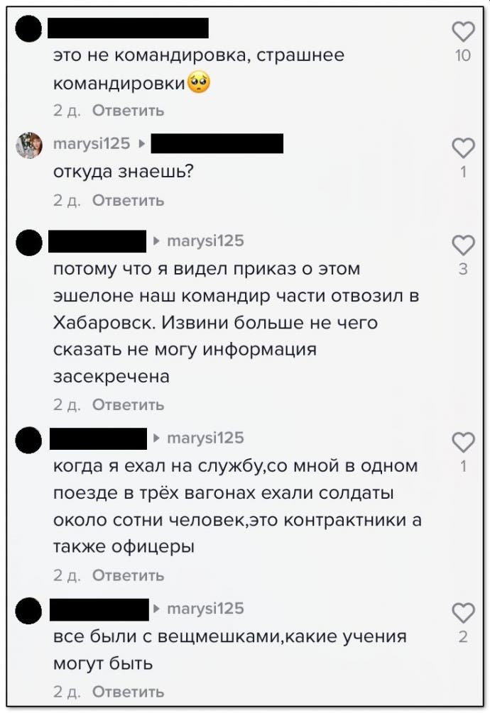 Аналитики CIT изучили несколько новых видео о переброске техники, которые появились в TikTok за последнюю неделю: в том числе, снятых во время проезда эшелонов через Хабаровск и Еврейскую автономную область. Указанные видео собрали сотни комментариев, авторами которых являются родственники контрактников и сами военные.