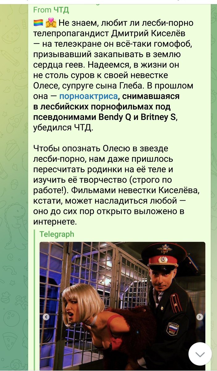 Жена сына российского пропагандиста Дмитрия Киселёва Олеся выступает в лесби-фильмах для взрослых под псевдонимами «Britney S» и «Bendy Q».