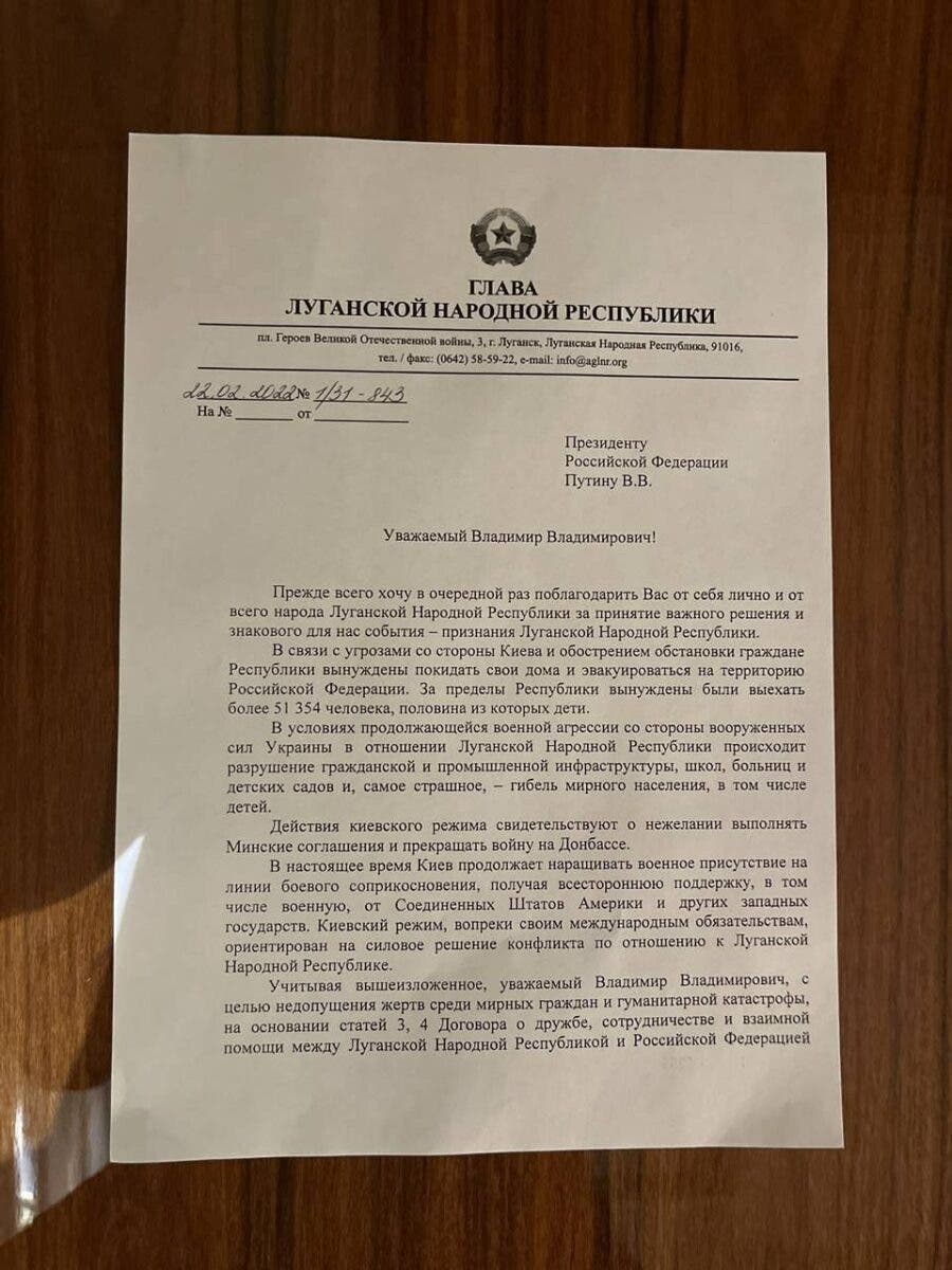 «Учитывая вышеизложенное, главы двух республик в связи со сложившейся обстановкой, а также с целью недопущения жертв среди мирных граждан и гуманитарной катастрофы на основании статей 3 и 4 договоров о дружбе, сотрудничестве и взаимной помощи между РФ и республиками просят президента России оказать помощь в отражении агрессии вооруженных сил и формирований Украины», — подытожил Песков.