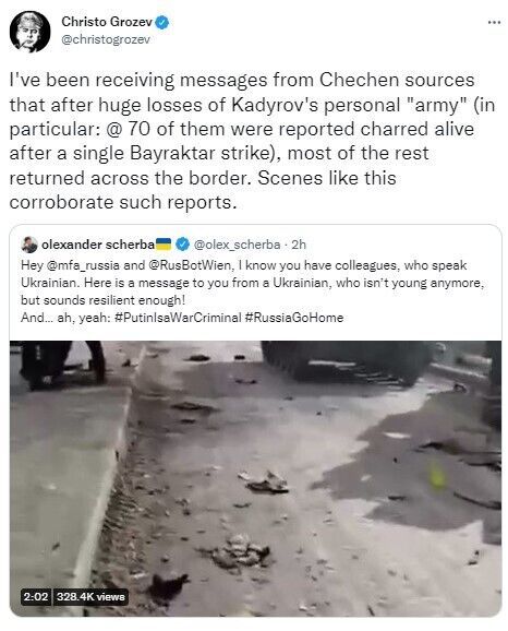 В воскресенье, 27 февраля, в Буче на Киевщине "армия" главы Чечни Рамзана Кадырова понесла огромные потери. В частности, 70 человек сгорели заживо после единственного удара Bayraktar.