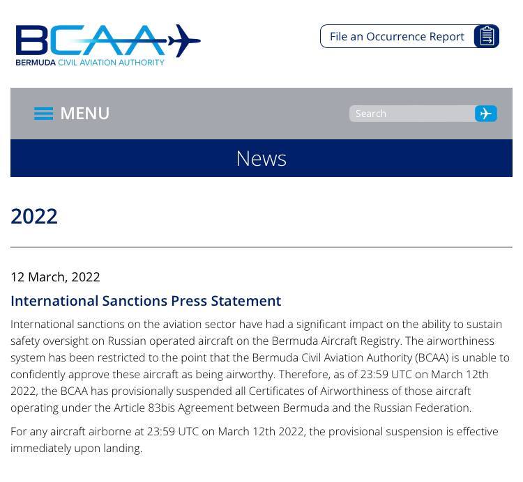 «Таким образом, по состоянию на 23:59 UTC 12 марта 2022 года (на 02:59 13 марта мск) BCAA временно приостановила действие всех сертификатов лётной годности (СЛГ) этих воздушных судов, эксплуатируемых в соответствии со статьей 83bis Соглашения между Бермудскими Островами и Российской Федерацией», — сообщили авиавласти Бермуд.