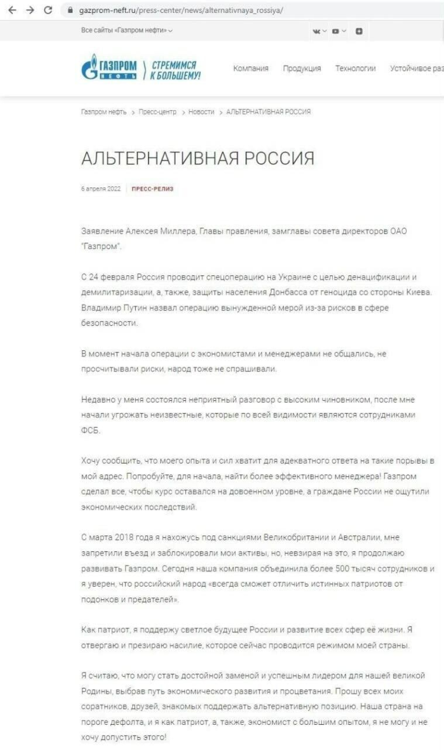 Помимо того, на главной странице сайта Газпрома появилось обращение якобы от лица председателя правления компании Алексея Миллера. Текст содержит критику кремлевского режима из-за его действий в Украине, приведших РФ к экономическому кризису, а также призывы свергнуть Путина, отдав власть Миллеру.