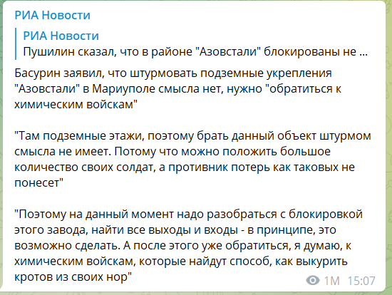 Сегодня один из главарей боевиков "ДНР" Эдуард Басурин заявлял, что штурмовать подземные укрепления "Азовстали" в Мариуполе нет смысла, и предлагал "найти все выходы и входы", а после этого "обратиться к химическим войскам".