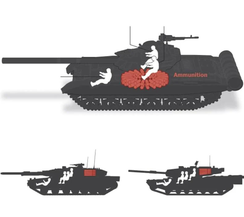 Боеприпасы в большинстве западных танков могут храниться под полом башни, защищенной тяжелым корпусом, или в задней части башни. В то же время такой отсек в самой башне является потенциально уязвимым для попадания, встроенные функции могут предотвратить «обезглавливание» танков.