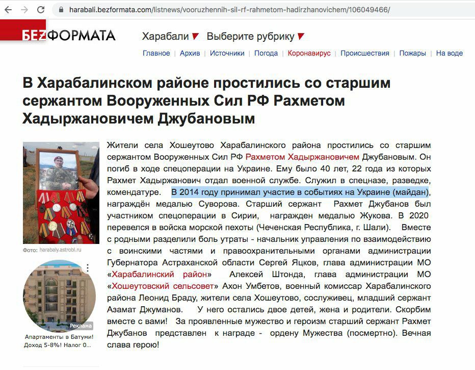 Та, российские СМИ опубликовали новость о гибели российского спецназовца Джубанова из Астраханской области в Украине.