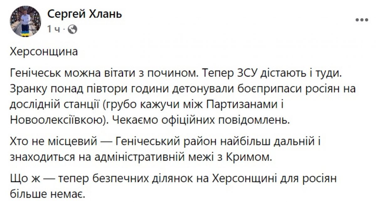"Геническ можно поздравлять с почином. Теперь ВСУ достают и туда. С утра более полутора часов детонировали боеприпасы россиян на опытной станции (грубо говоря между Партизанами и Новоалексеевкой). Ждем официальных уведомлений", - сообщил он.
