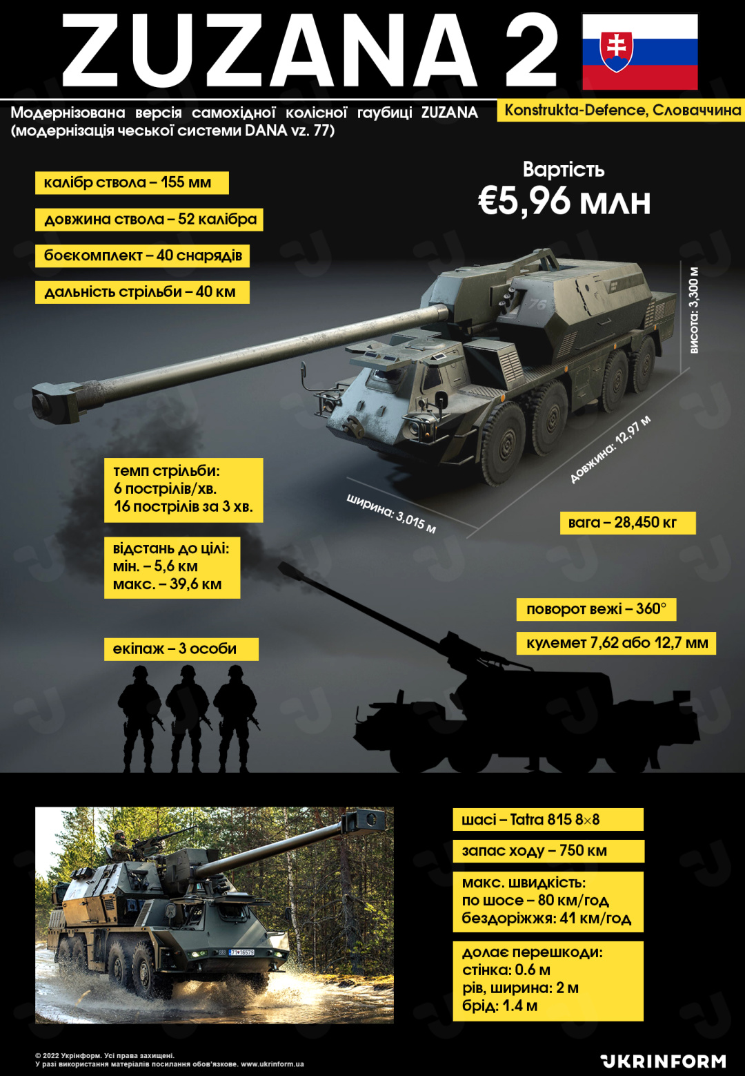 САУ Zuzana 2 является модернизацией предыдущей версии Zuzana калибра 155 мм. В 2018 году армия Словакии закупила 25 артустановок. Их передали в армию в 2021 году для замены предыдущего поколения.