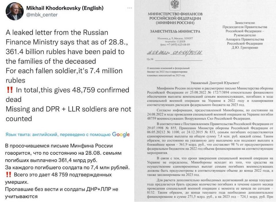 В нем говорится, что по состоянию на 28 августа семьям 48 759 погибших захватчиков необходимо выплатить 361,9 млрд. рублей.