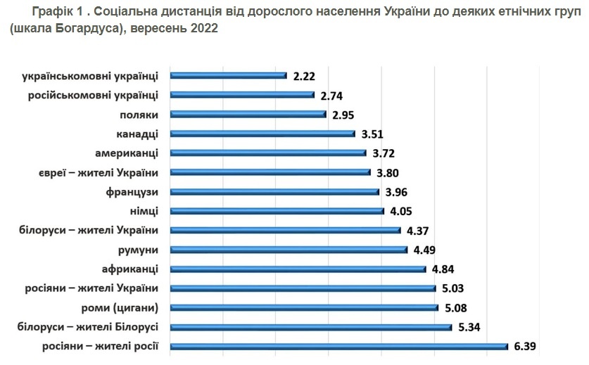 Самыми близкими респонденты считают украиноязычных украинцев (коэффициент 2,22), русскоязычных украинцев (2,74) и поляков (2,95).