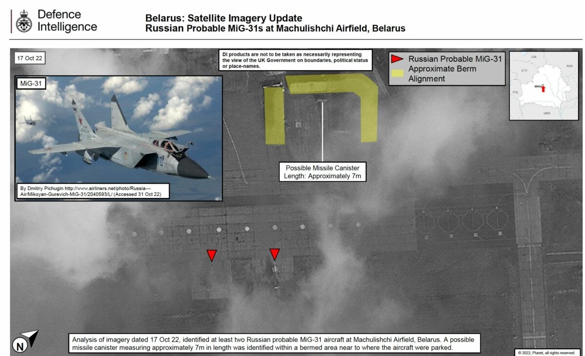 Спутниковое изображение показывает, что два самолета-перехватчика МиГ-31К почти наверняка были припаркованы на белорусском аэродроме Мачулищи 17 октября, а рядом с ними в защитной земляной насыпи хранился большой контейнер.