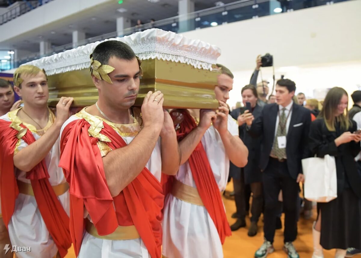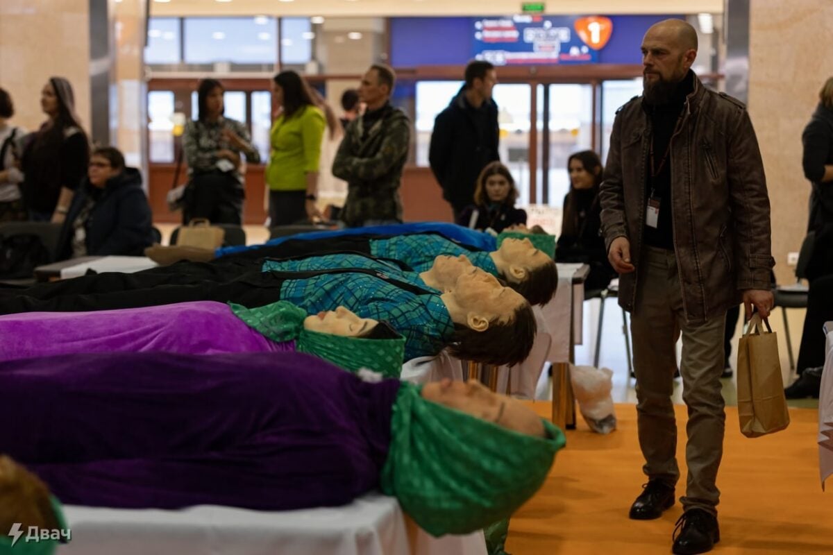 На выставке представлены последние модели гробов и надгробий, а также новинки похоронного убранства. Во время мероприятия проводят мастер-классы, а все желающие могут сделать фото с парнем в гробу.