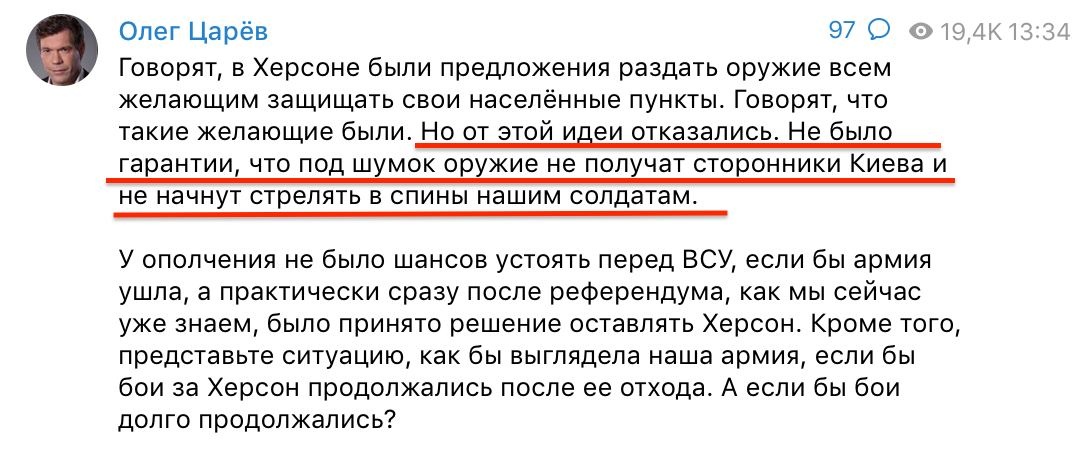 Показательный пост Олега Царева. Тот признается, что российские оккупанты боятся раздавать оружие на оккупированных территориях даже своим сторонникам, так как понимают, что им будут стрелять в спину.