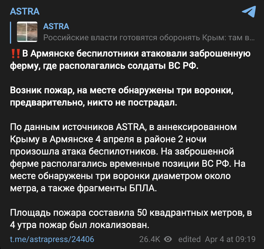 За вечерний налет на Одессу, ВСУ тут же ответили налетом по базе оккупационных войск в оккупированном Крыму, недалеко от города Армянск. Вот что об этом пишут их телеграмм-каналы.