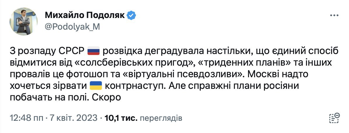 Информация о так называемой «утечке секретных документов» о контрнаступлении Украины является обычным блефом со стороны России и элементом оперативной игры российской разведки. Об этом заявил советник руководителя Офиса Президента Михаил Подоляк.