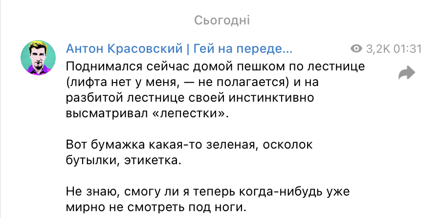Очевидно, он не на шутку испугался после отправки на тот свет "военкора" Владлена Татарского. В своем Телеграмм-канале Красовский признается, что больше никогда уже, возможно, не будет чувствовать себя в безопасности.