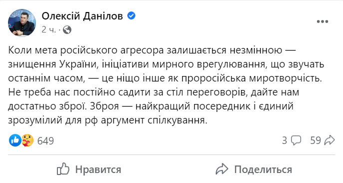 Любые заявления о необходимости начала мирных переговоров с Россией являются миротворчеством в интересах Москвы, которая не меняла своих целей по уничтожению украинской государственности. Об этом на своей странице в социальной сети Facebook сообщил секретарь СНБО Алексей Данилов.