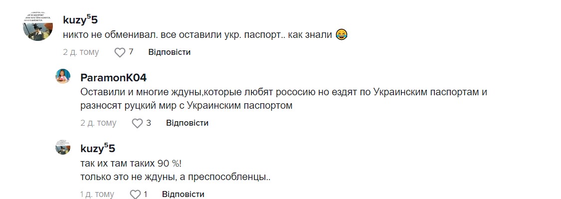 "В 14 году, когда Крым захватила россия, выдавали российские паспорта в обмен на украинские. Я уехала из Крыма, а моя подруга осталась, потому что у нее там семья, дом, работа. Но украинский паспорт она не сдала. И вот она мне сегодня пишет, что "Я уже получила украинский паспорт, я вас уже жду", – рассказывает девушка. По ее словам, многие оккупанты и фанаты "русского мира" сейчас сбегают с полуострова на россию в страхе перед наступлением ВСУ.