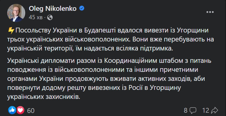 Во вторник, 20 июня, Будапешт согласился вернуть домой трех бойцов ВСУ, хотя до этого государственный секретарь Венгрии по международным коммуникациям Золтан Ковач заявил, что Будапешт не следит за передвижениями 11 военнопленных украинцев из Закарпатья, которых Россия ранее передала венгерской стороне.