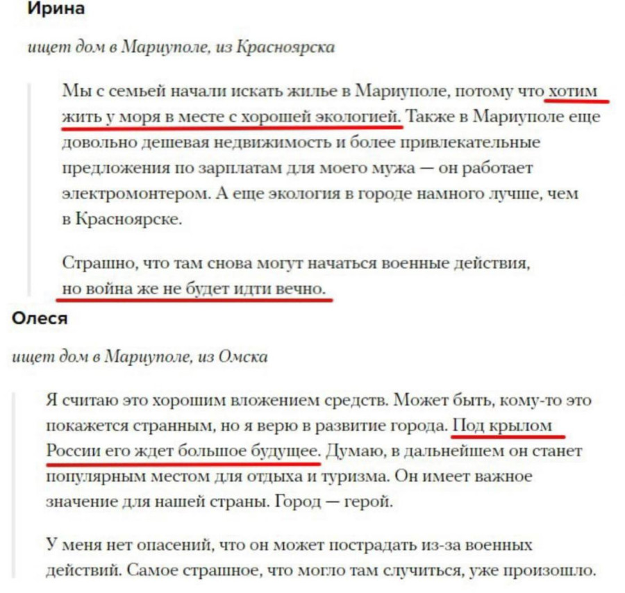 Россияне готовы покупать недвижимость в Мариуполе, в частности, из-за того, что уже считают его «территорией России». Хотя именно российские войска оккупировали этот город и практически полностью разрушили его, в результате чего погибло и мирное население.