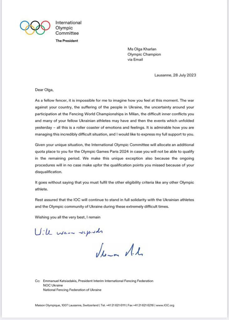 Международный олимпийский комитет автоматически квалифицировал украинскую фехтовальщицу Ольгу Харлан на Игры-2024. Об этом сообщает министр спорта Украины Вадим Гутцайт.