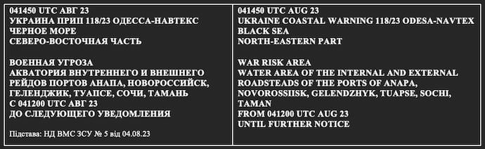 Предупреждение выпущено 4 августа на основании НД ВМС ВСУ от той же даты и будет действовать до уведомления об отмене.