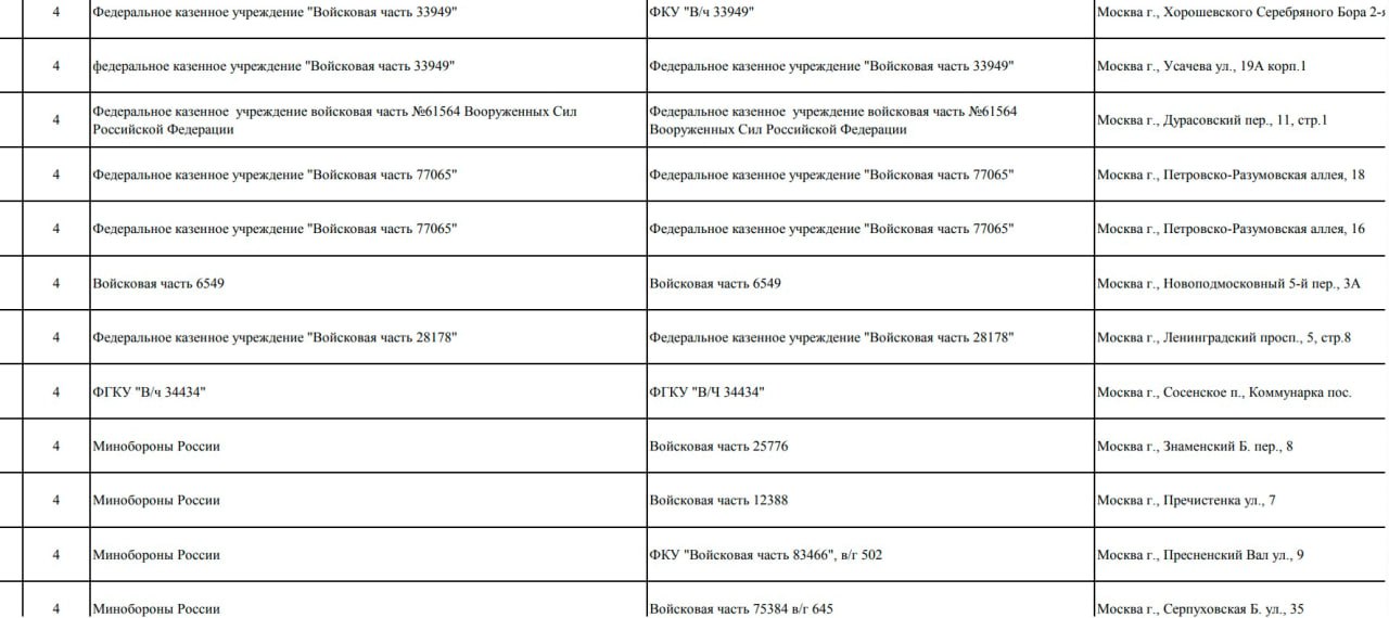 Расследователи отмечают, что в документе опубликовали адреса всех воинских частей, учреждений и организаций министерства обороны РФ, дислоцированных в Москве, в том числе ГРУ — российской военной разведки. В списке значатся объекты в Серебряном Бору, в том числе дачи, связанные со Службой внешней разведки (СВР), Минобороны и МВД.