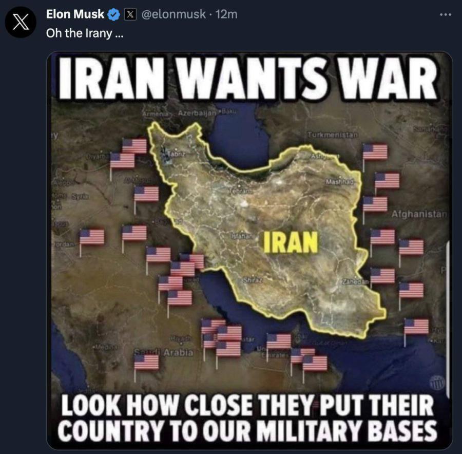 Любитель государственных льгот опубликовал в своей соцсети картинку, намекающую, что настоящий агрессор на Ближнем Востоке не Иран, а США.
