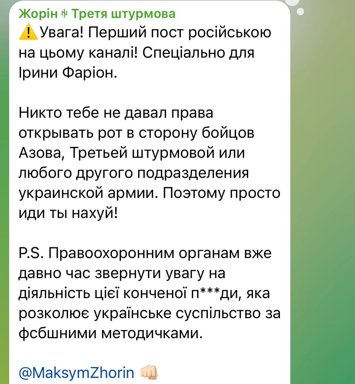 Реакция появилась в Телеграм-канале Жорина, который военный ведет на украинском языке. Воин отметил, что первая публикация российскому на его канале посвящается лично Ирине Фарион.