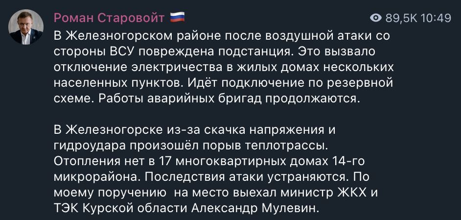 Позже Старовойт сообщил, что Железногорск полностью отключили от электричества и теплоснабжения.
