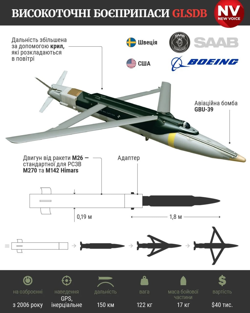 Дальнобойная крылатая бомба способна поразить цель на расстоянии в 150 километров. Снаряд является экспериментальным гибридом, сочетающим в себе авиационную бомбу малого диаметра GBU-39 с ракетным двигателем от реактивного снаряда M26.
