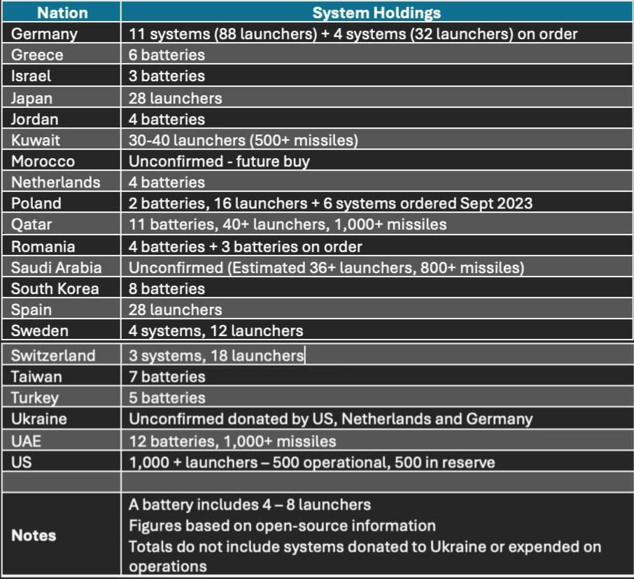 В издании отмечают, что на сегодняшний день компания-разработчик этой системы ПВО Raytheon спроектировала и отправила в 19 разных стран мира 240 установок. В свою очередь производитель ракет Patriot Lockheed Martin изготовил более 10 тысяч снарядов. Кроме США, больше всего этих установок также имеют Германия, Кувейт, Нидерланды, Греция, ОАЭ, Тайвань, Турция и другие.