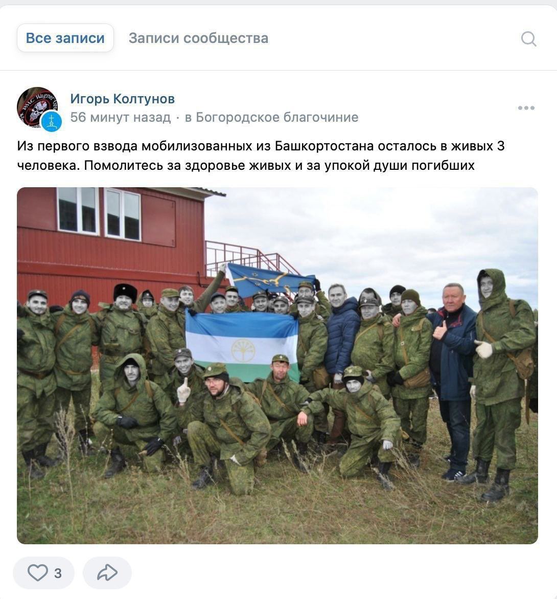 "С 1-го взвода мобилизованных Башкортостана осталось в живых 3 человека. Помолитесь", - говорилось в сообщении.