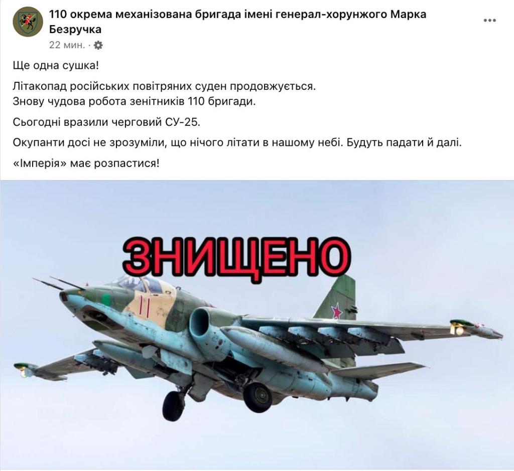 На Авдеевском направлении украинские воины сбили российский штурмовик Су-25. Об этом сообщили военные из 110-й отдельной механизированной бригады.
